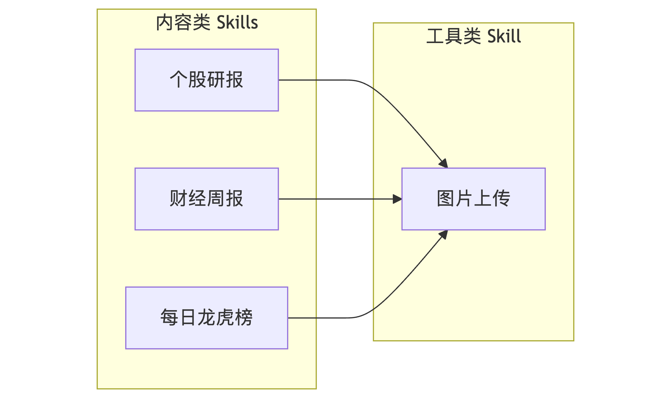 这种拆分使得每个 Skill 的数据源和处理逻辑独立,便于迭代和排查问题。