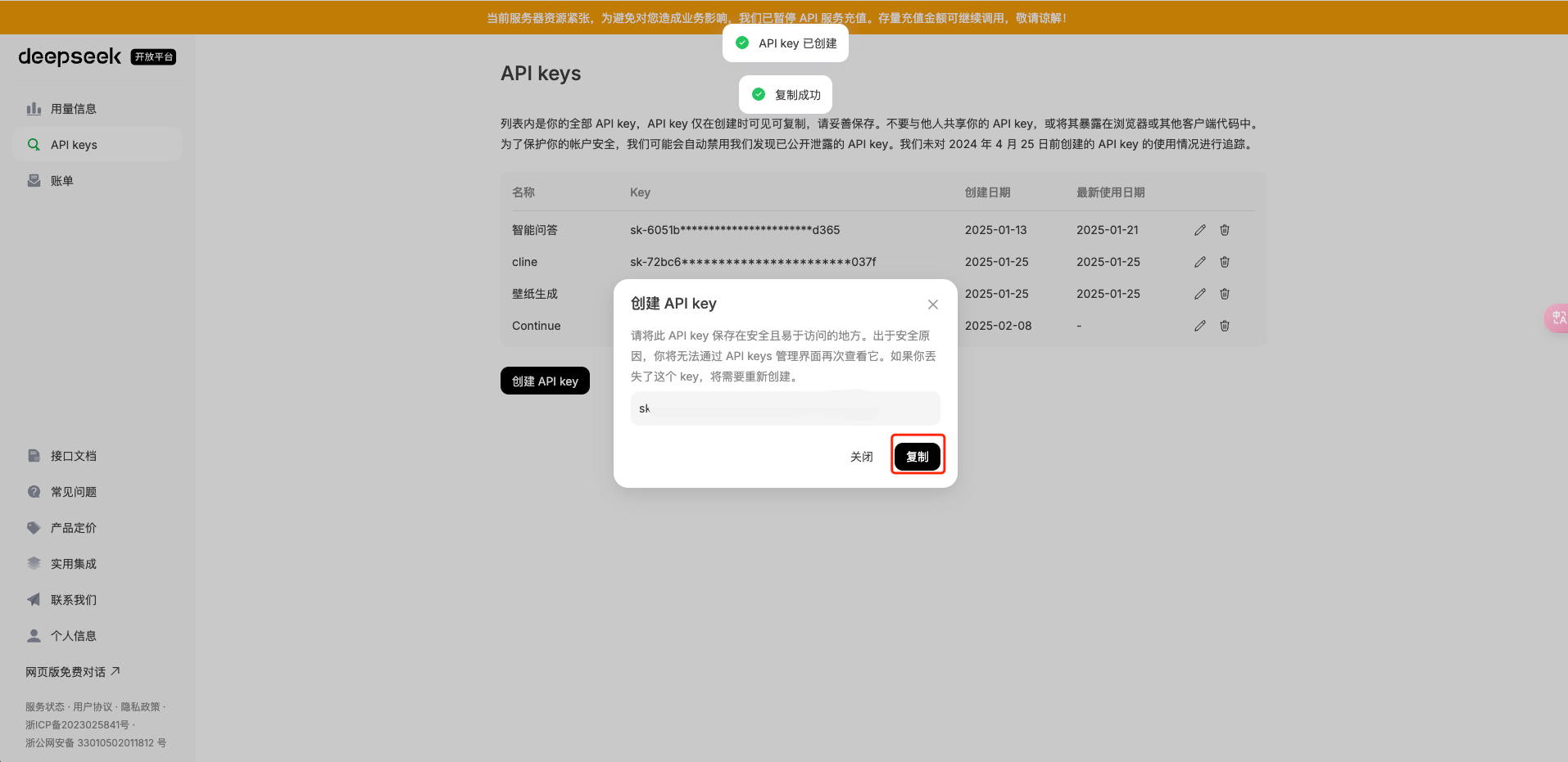 接下来,你需要获取 DeepSeek 的 API 密钥。访问 DeepSeek 开放平台,创建一个新的 API Key。请务必妥善保存这个密钥,因为一旦丢失,你将需要重新生成一个新的密钥。