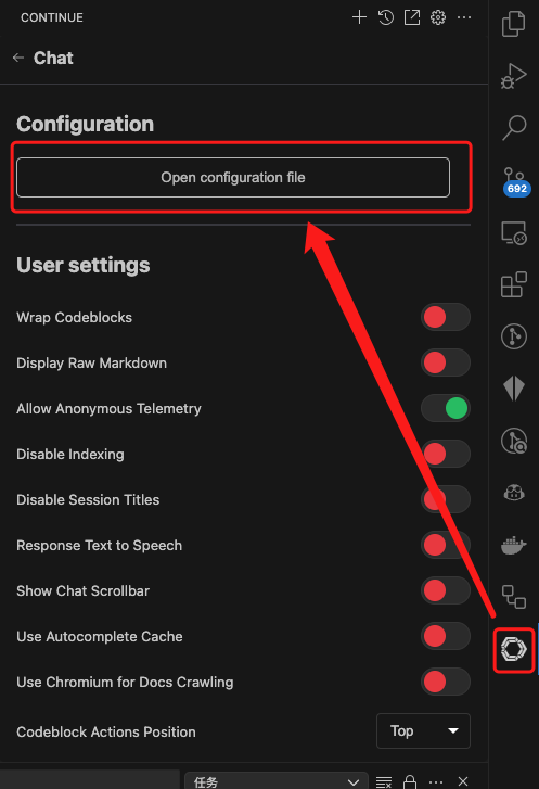 首先,打开 VSCode 的扩展商店,搜索 Continue,然后点击安装。安装完成后,你可以在 VSCode 的侧边栏中找到该扩展。