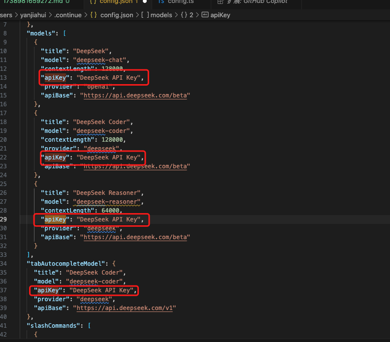在 config.json 文件中,将 apiKey 字段替换为你刚刚生成的 DeepSeek API Key。保存设置后,你就可以在 VSCode 中使用 DeepSeek 的强大功能了。