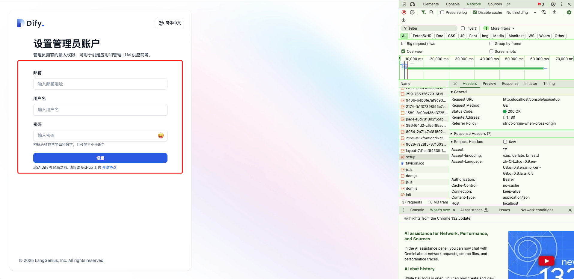 如果打开后,一直是如下图的情况,不要着急,可以打开 F12,在 Network 中,找到 setup 请求,看看是否已经正常返回 200(我这边大约1分钟左右)。请求成功后刷新页面即可看到图二中的设置账户密码页面。