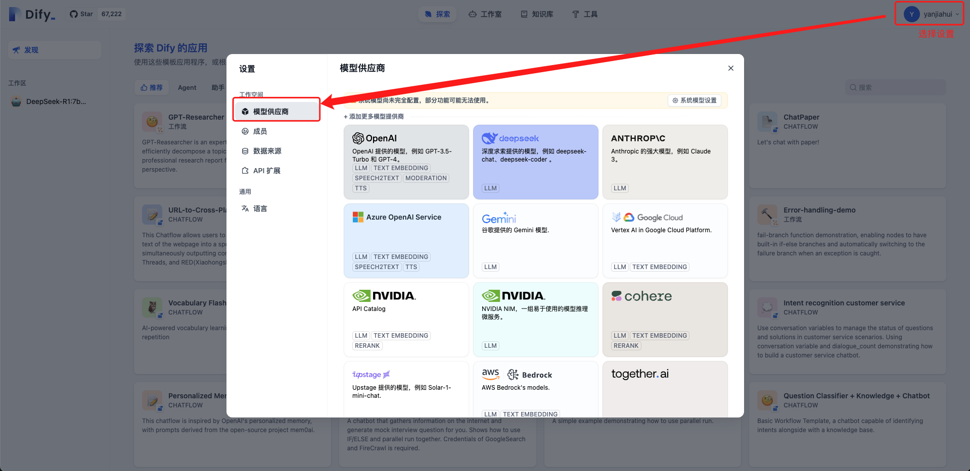 在首页右上角,找到个人信息处(右上角),点击设置。切换到模型供应商 Tab 页签。