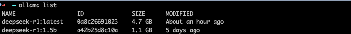 deepseek-r1:latest 0a8c26691023 4.7 GB About an hour ago