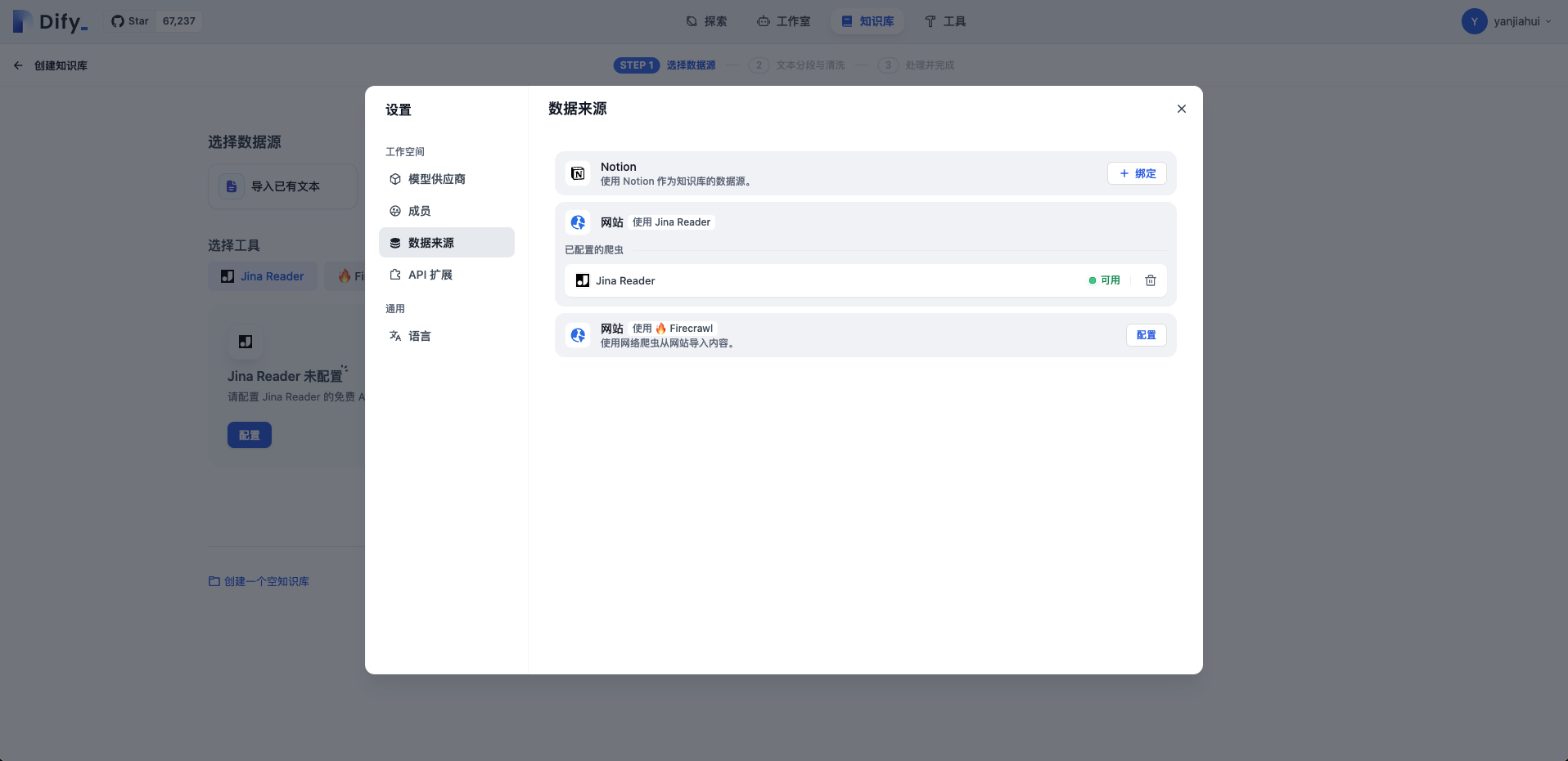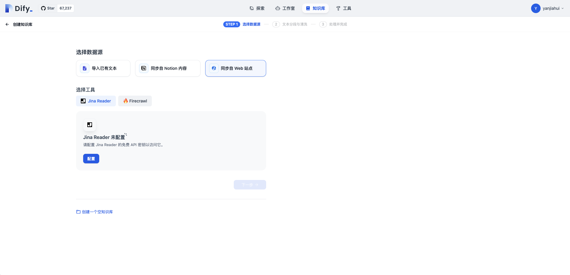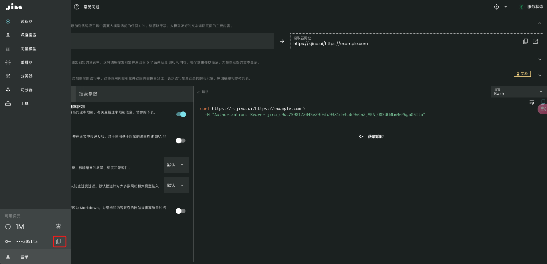 直接在 https://jina.ai/reader/ 注册账号,随后在左下角复制自己的密钥,填写进 Dify 即可。