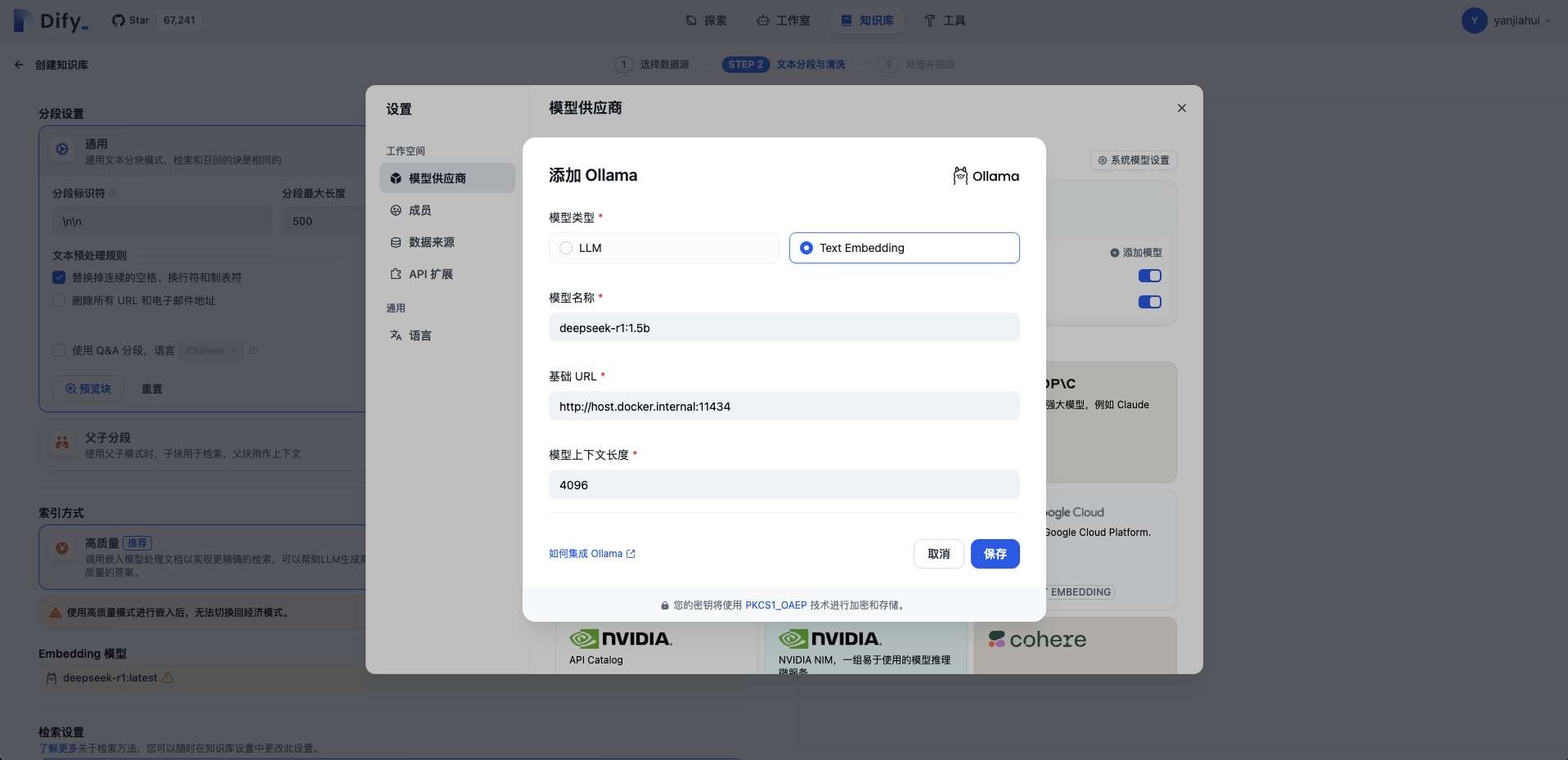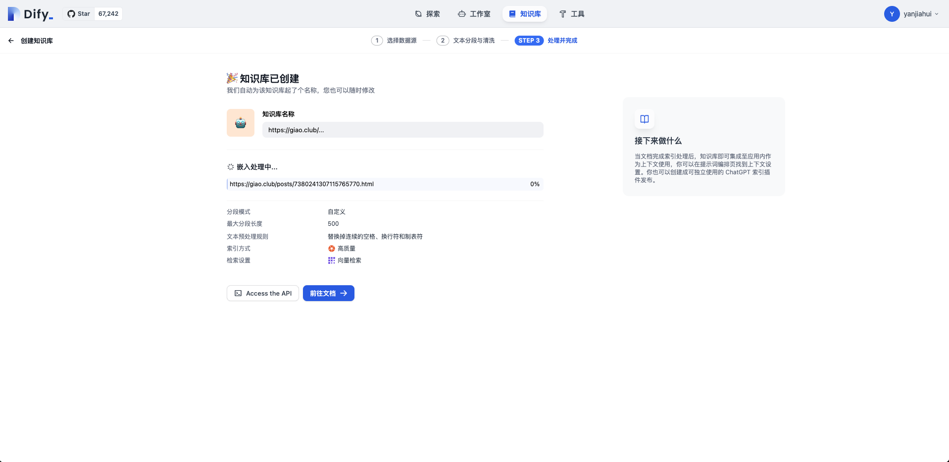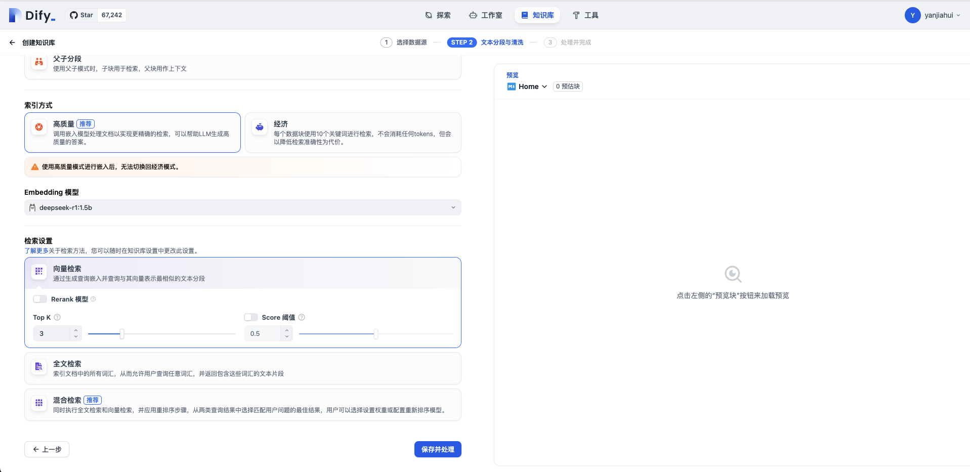 这里会使用到前面添加的 Embedding 模型。其他的都用默认值,点击保存并处理。