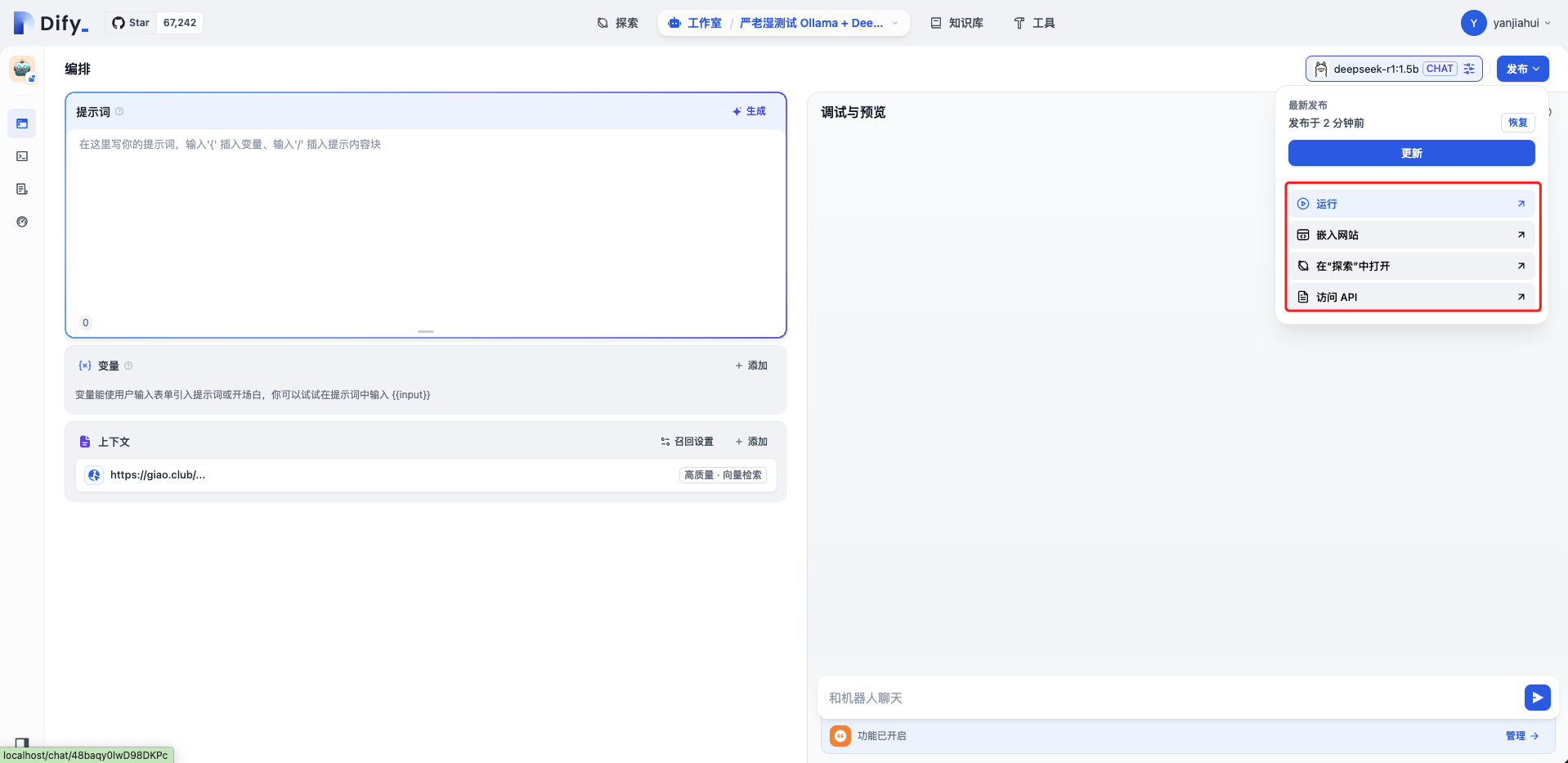 你可以选择运行、嵌入网站,或者 API 方式调用。