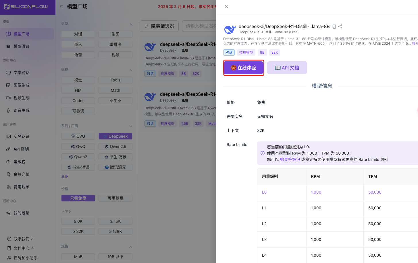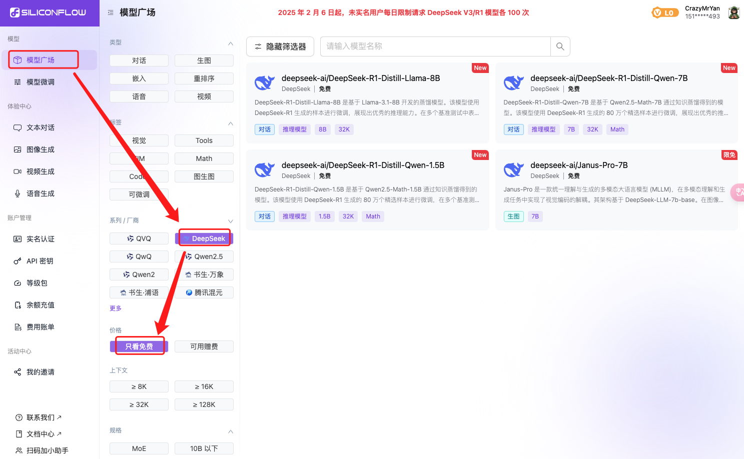 只需要去模型广场,找到【只看免费】,我这里还筛选了个 DeepSeek,大家可以按需查找。我这里选的是 8B 的DeepSeek。
