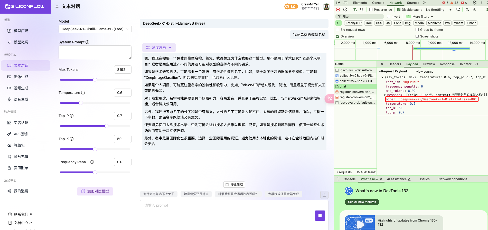 随便输入一个聊天内容,打开F12直接找到 Payload 参数中的 model 这个就是免费的模型名称。