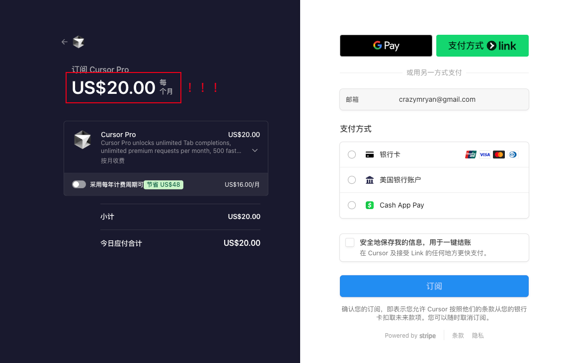 本文主要给大家讲解下如何薅 Cursor 的羊毛。如图 $20 一个月还是有些许心疼的。