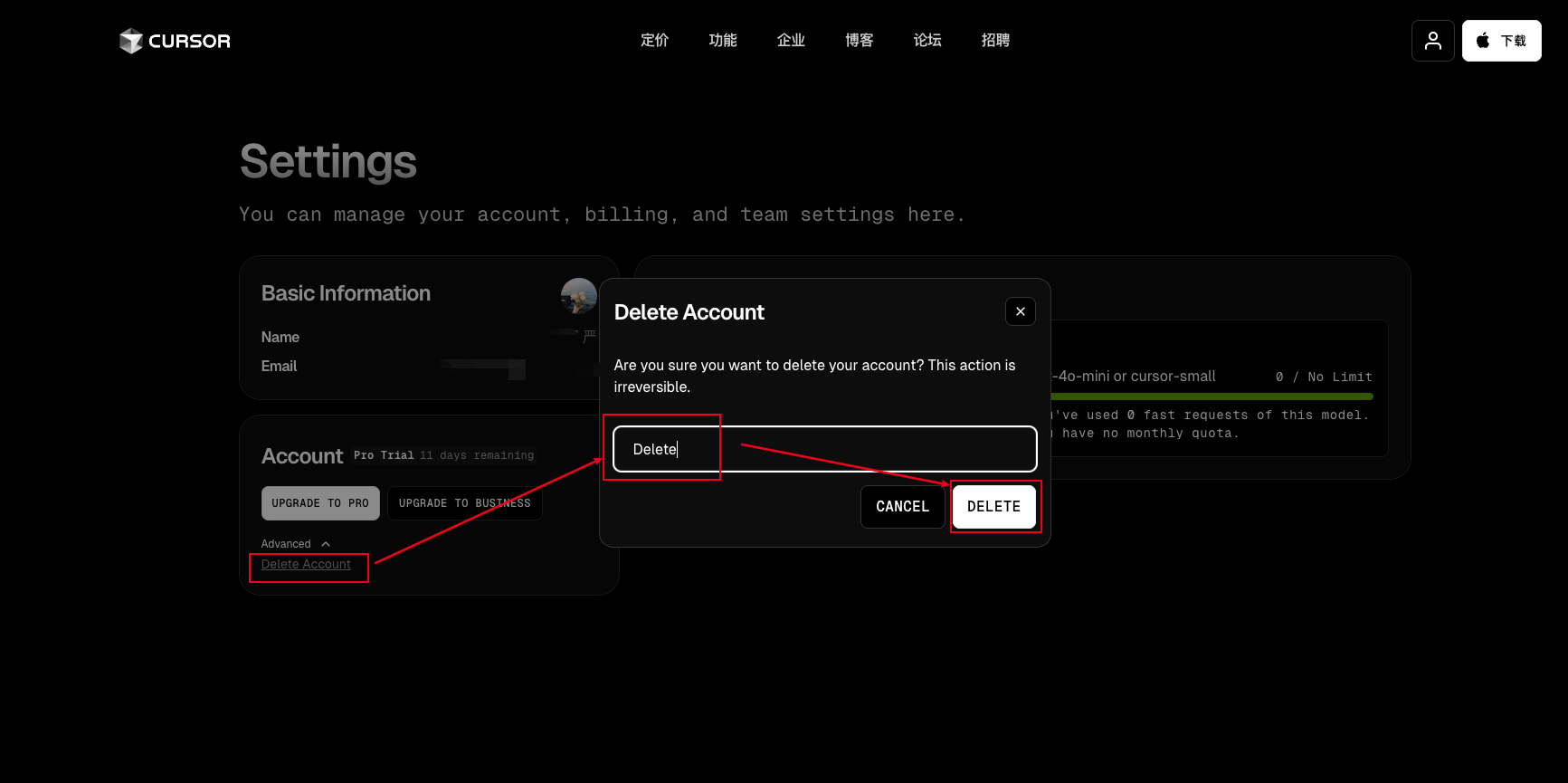 注意这里有个 Delete Account (删除账户)按钮