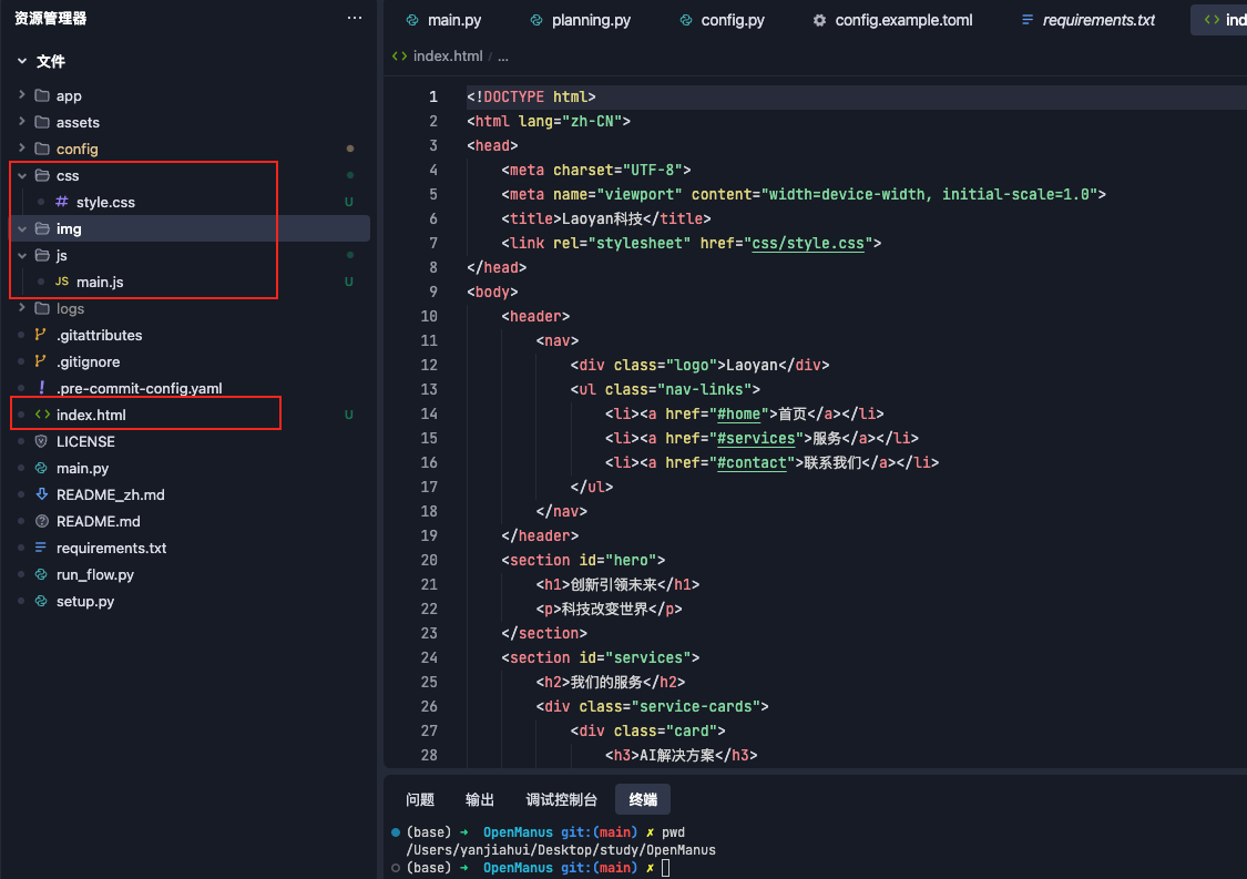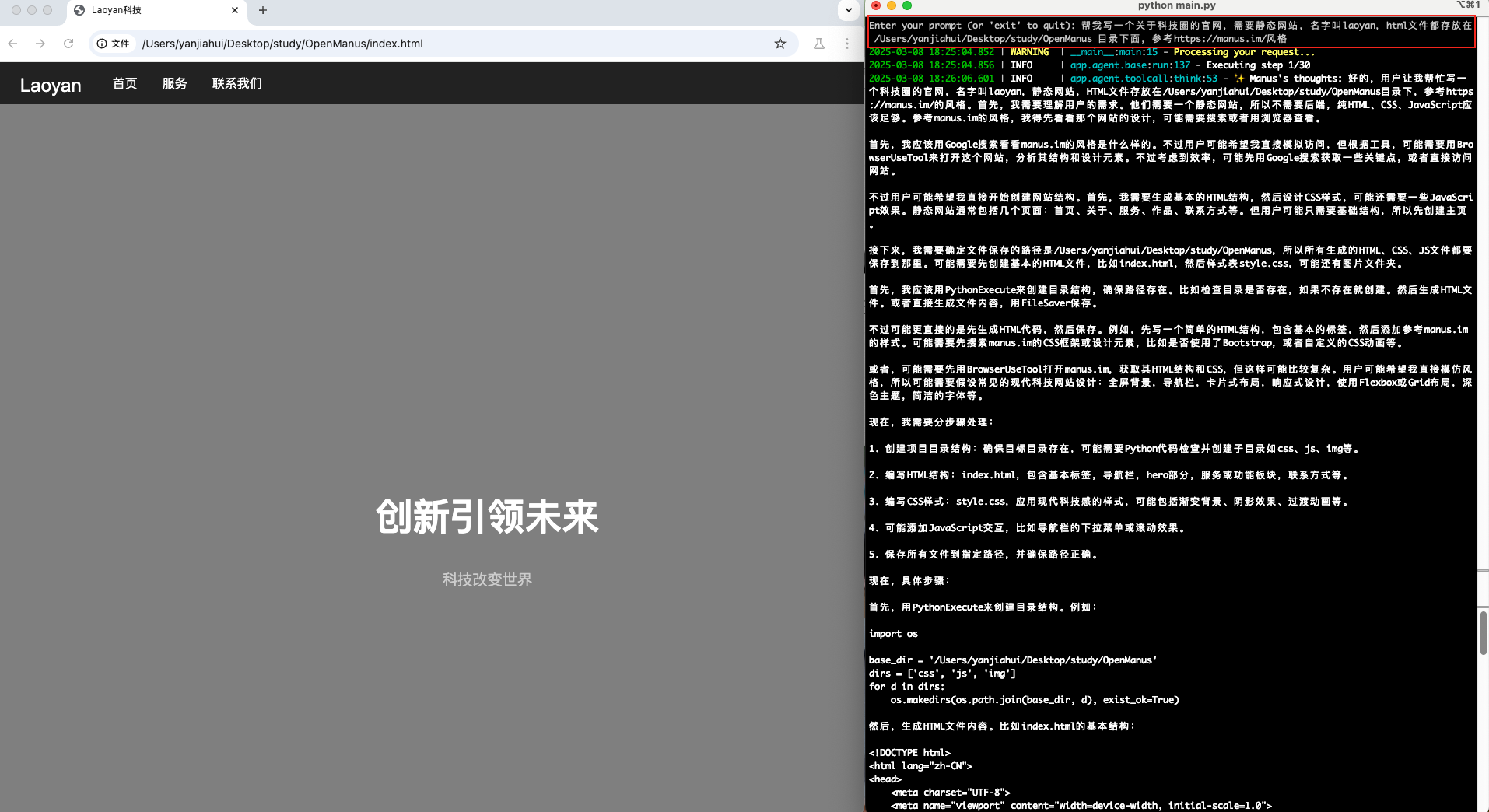 帮我写一个科技圈的官网,名字叫laoyan,静态网站,HTML文件存放在/Users/yanjiahui/Desktop/study/OpenManus目录下,参考 https://manus.im/ 的风格