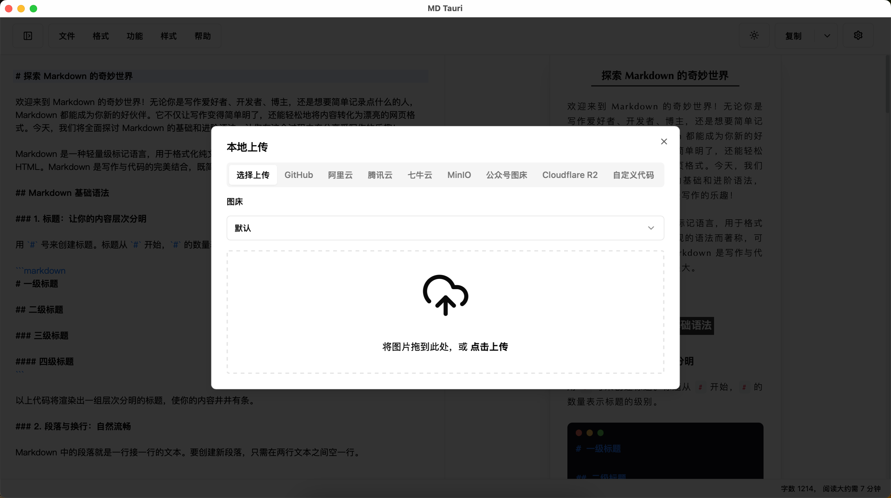 但每次都需要打开网页,进行编辑,而且信息都存储在远端觉得有点麻烦,所以找了一个开源仓库doocs/md用它来作为模板进行开发,实现了一个桌面端markdown编辑器md-tauri,也是开源的。 可以直接下载安装使用。