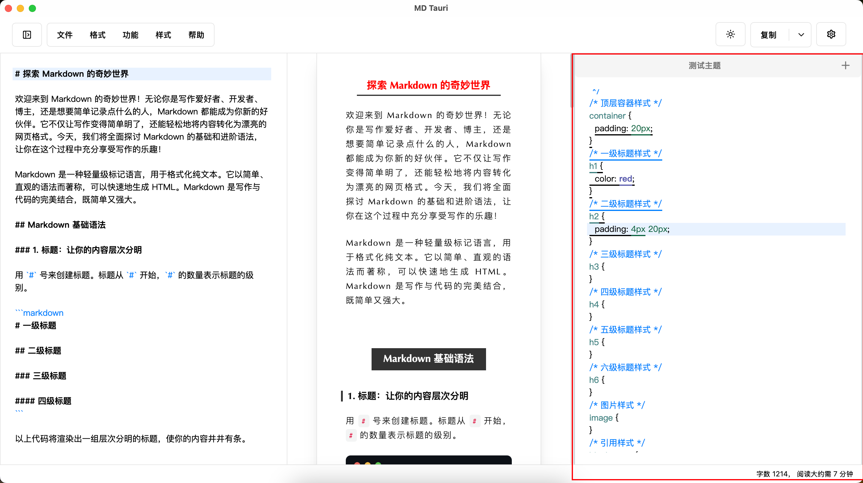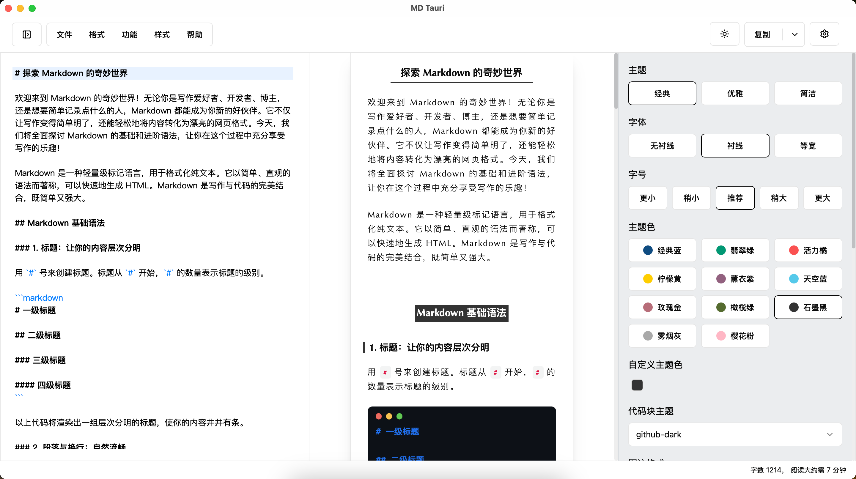 目前支持三种主题和多种主题色,以及代码块风格。