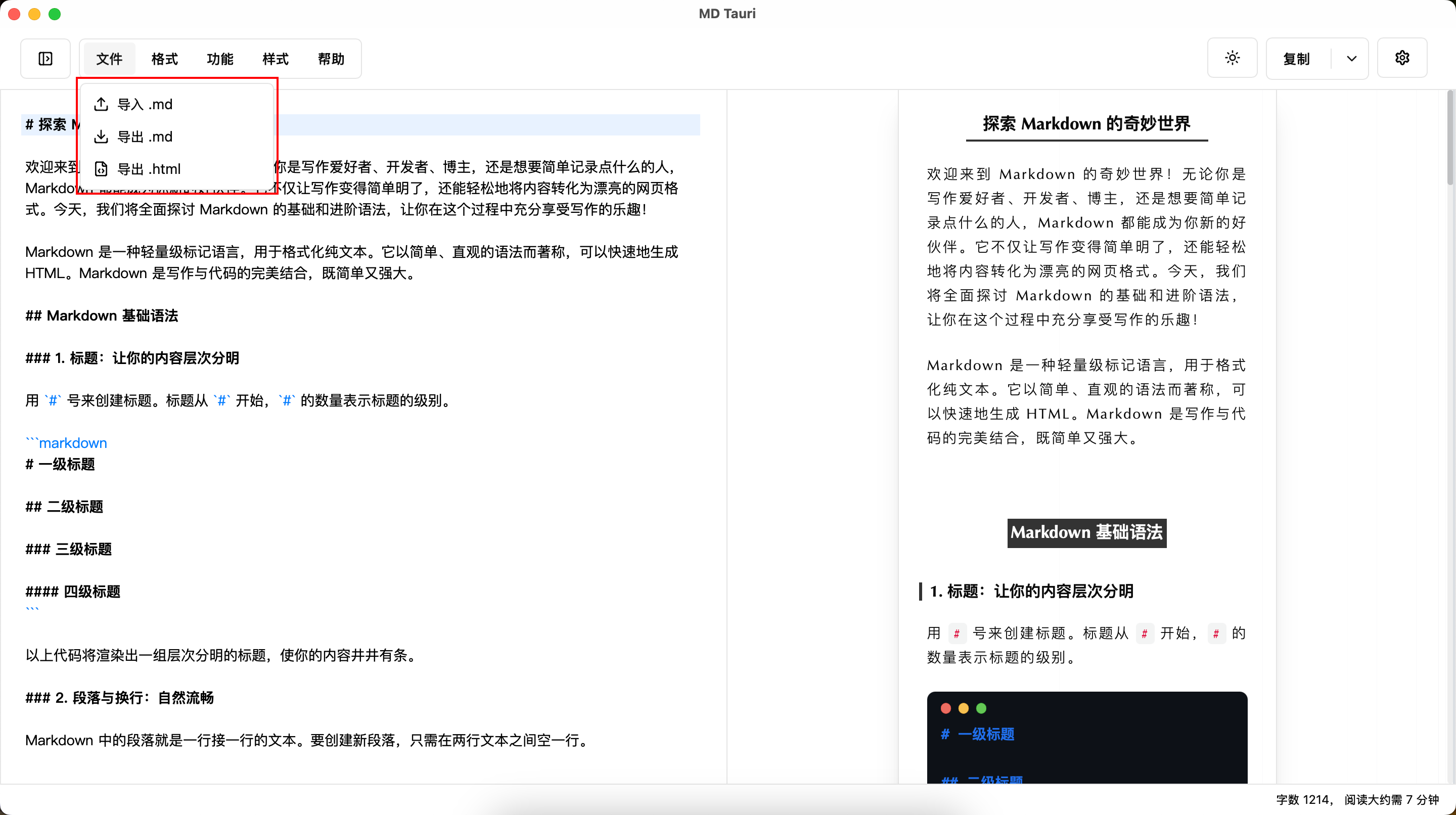 目前支持导入导出md、和导出html功能