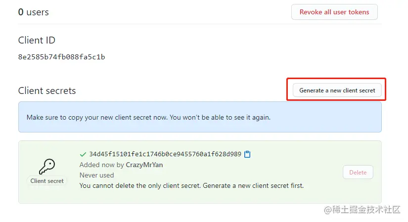 我们还需要创建这个 clientSecret 密钥 点击 Generate a new client secret 即可创建