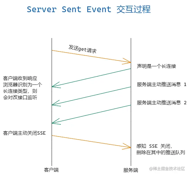 SSE 的本质其实就是一个 HTTP 的长连接,只不过它给客户端发送的不是一次性的数据包,而是一个 stream 流,格式为 text/event-stream。