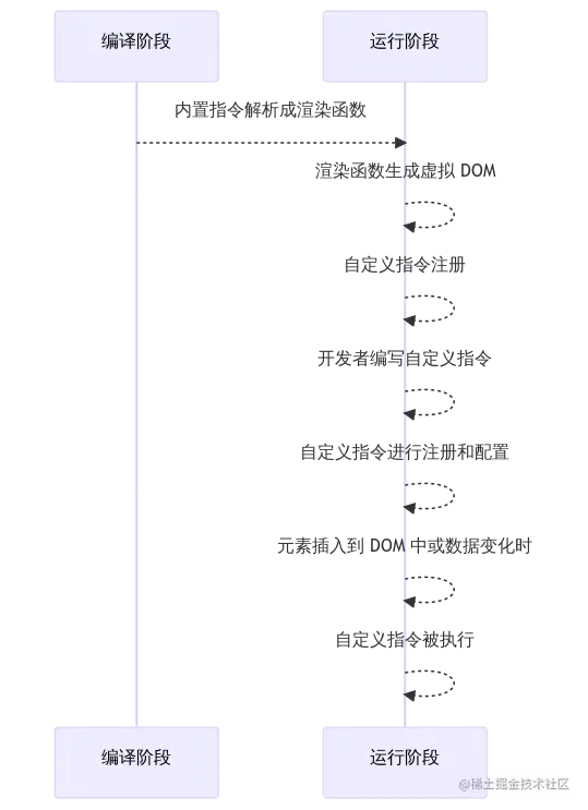 从下图中可以编译时内置指令在到 Render 时已经执行完成,然而到了运行时之后才开始自定义指令的解析工作。