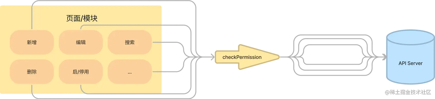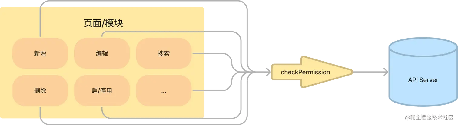 所以我们一个按钮权限应该是 页面::新增,接下来就需要一个checkPermission 方法来提供支撑。