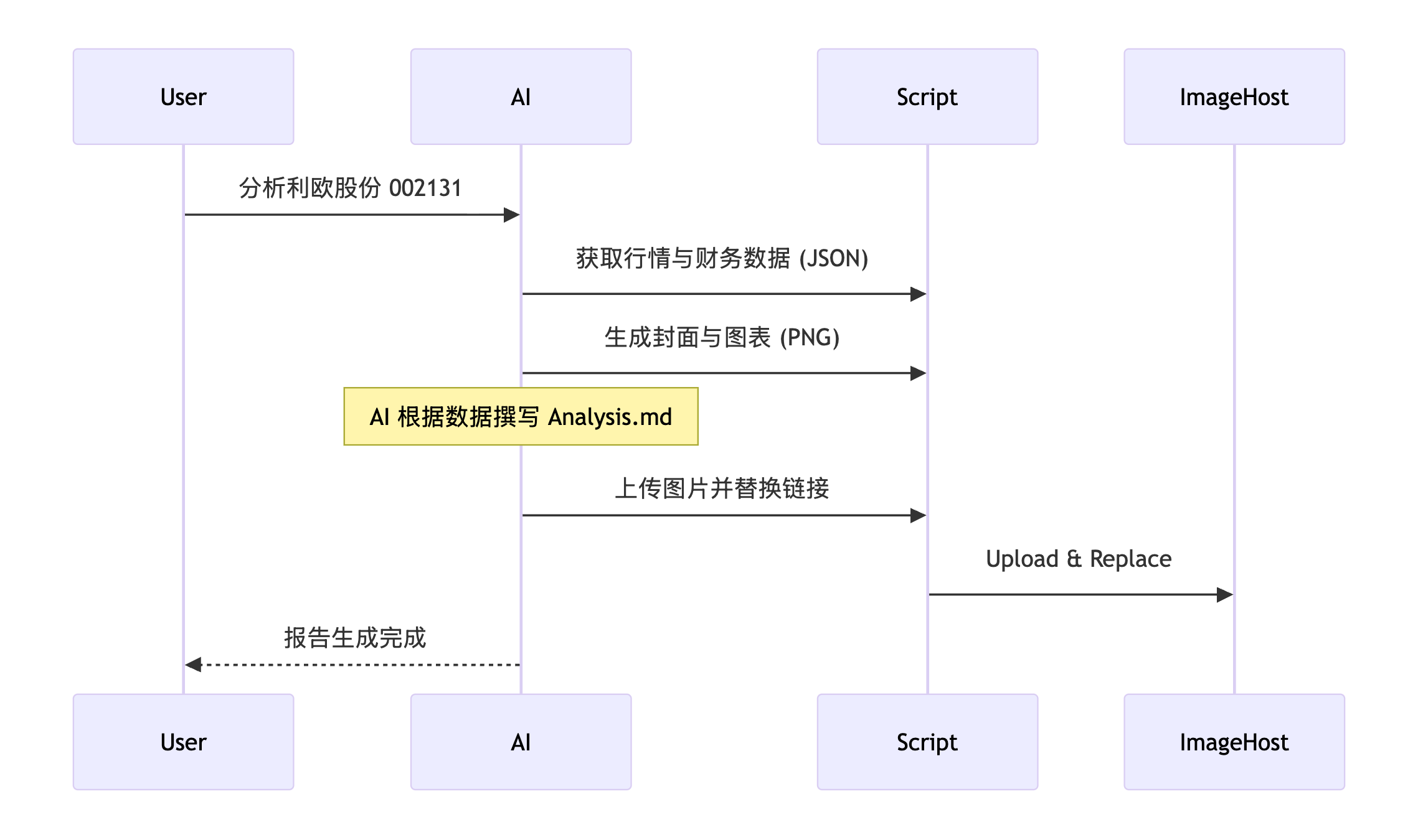 因此,财务和行情等结构化数据由 Python 脚本通过 API 获取;AI 仅负责处理非结构化信息(如新闻摘要、公告解读)和最终的分析写作。