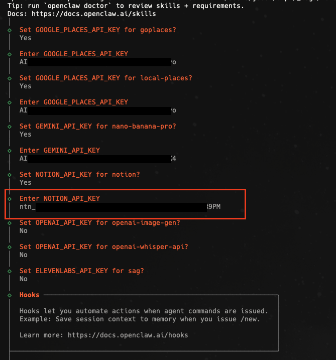 进阶配置: 在基础配置完成后,系统会询问是否配置 Skills、语音转换、图片生成等。其中有一个 Notion 选项,如果有需要(且前面做好了 Notion 准备工作),可以在这里选中。