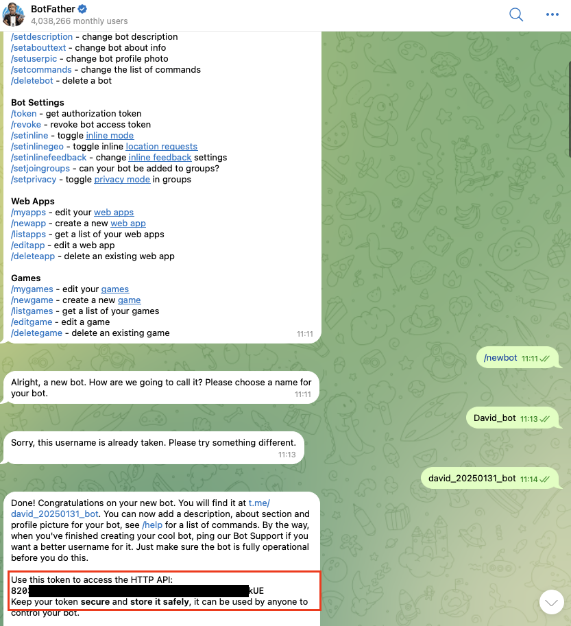 创建成功后,BotFather 会给你一段 API Token(格式如 123456:ABC-DEF...),请保存好,后续配置会用到。