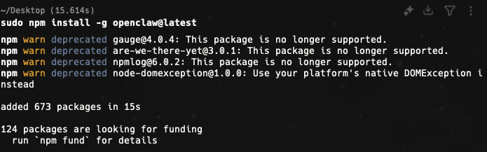 sudo npm install -g openclaw@latest安装完成图示: