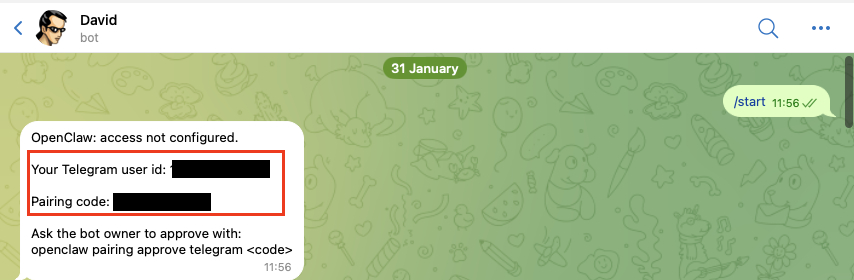 openclaw pairing approve telegram <code>配对成功后,你会看到类似下面的提示: