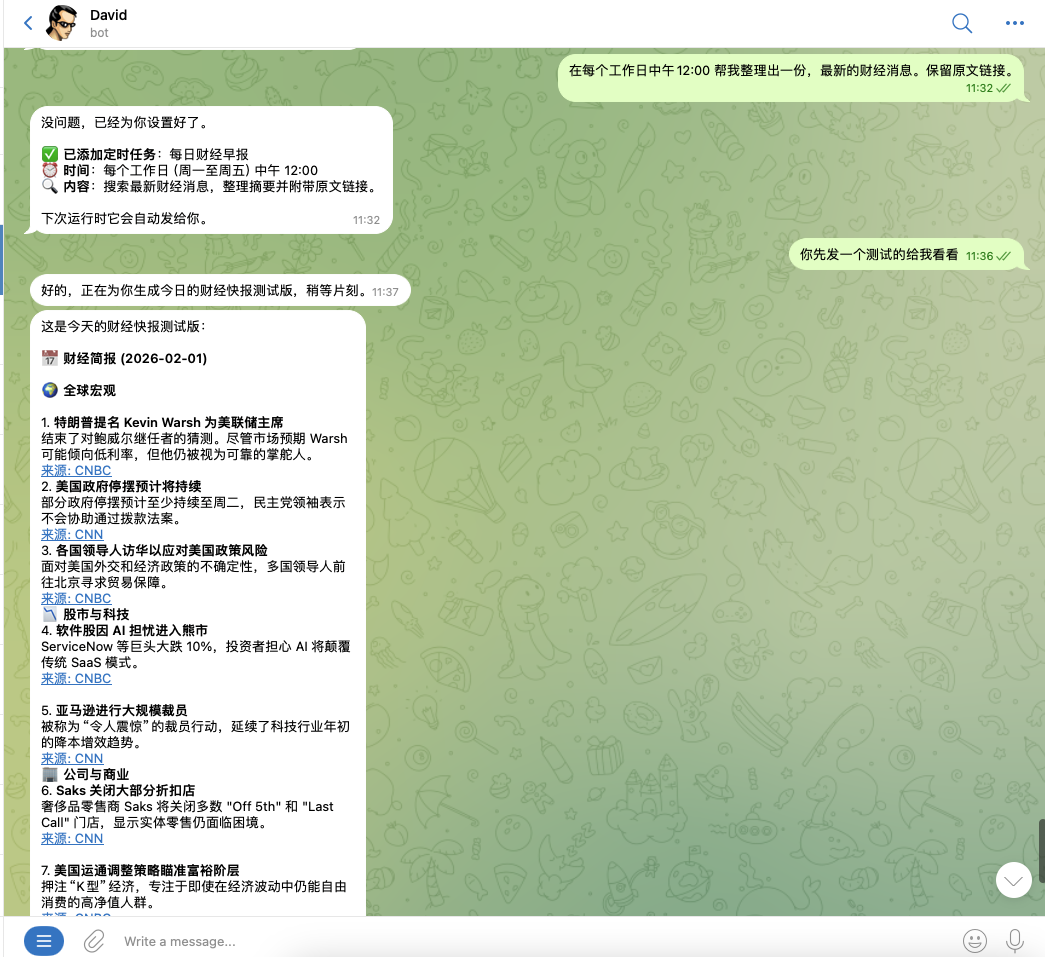 - 去 Telegram 找到你创建的机器人,随便发一句话。